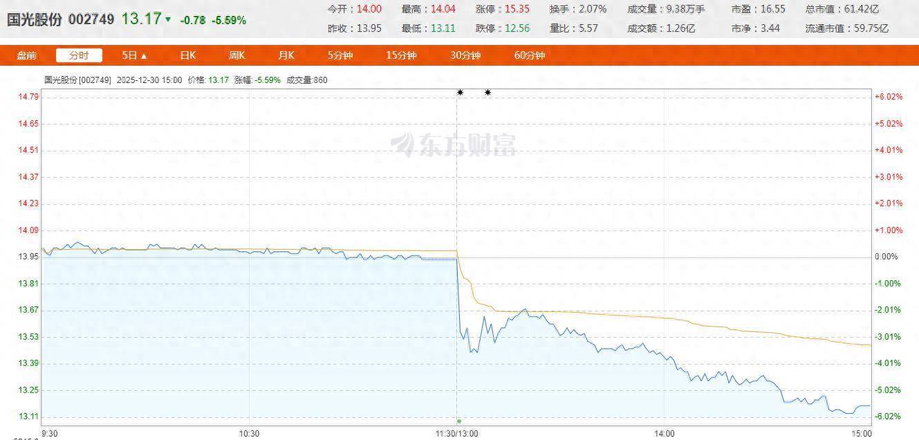 二级市场上,国光股份股价下午开盘应声下跌3%,随后继续一路走低,截至收盘跌5.59%,报13.17元/股。