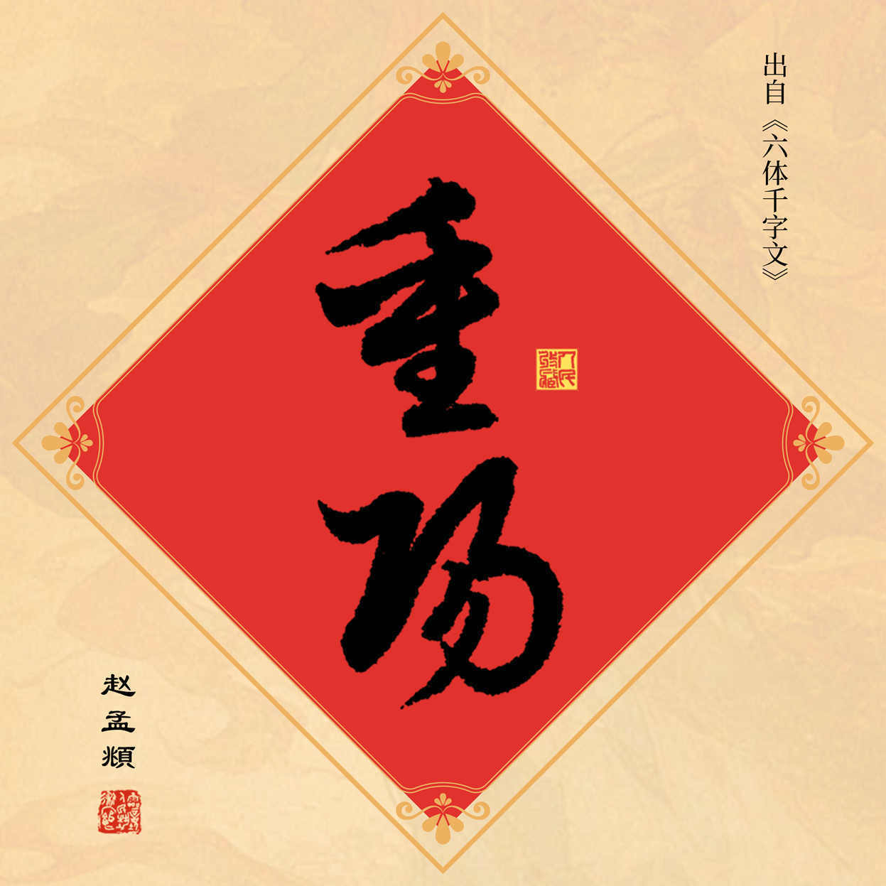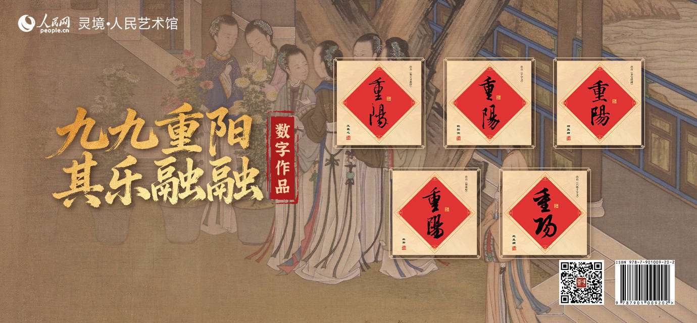 10月29日10时,灵境·人民艺术馆限量发行“九九重阳 其乐融融”数字作品,选取《集王圣教序》《千字文》《多宝塔碑》《蜀素帖》《六体千字文》碑帖中“重阳”,分别制作成“重阳—王羲之”“重阳—欧阳询”“重阳—颜真卿”“重阳—米芾”“重阳—赵孟頫”五款数字作品,各发行1000份,每份定价9.9元。